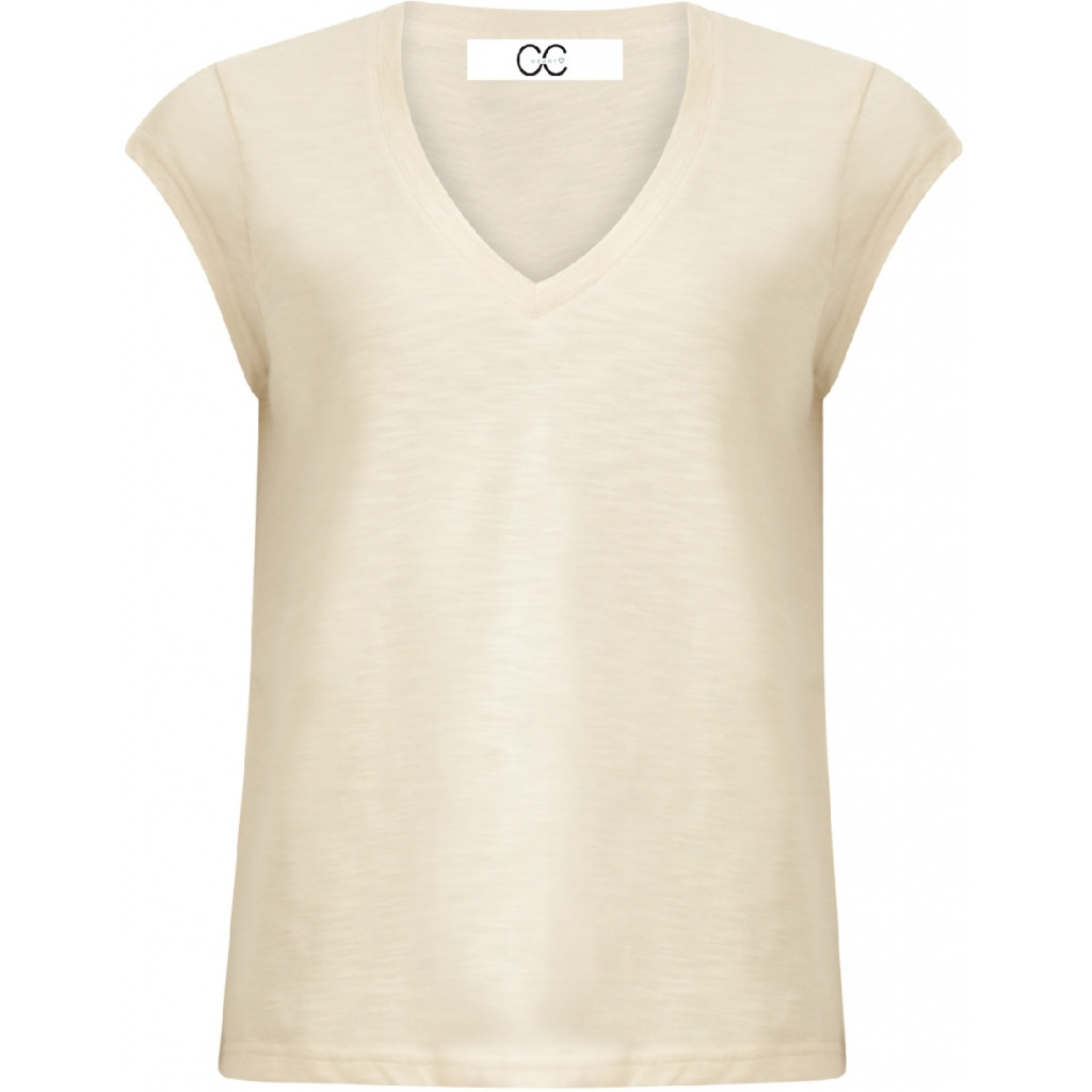 Coster Copenhagen tee i lys sand med v-hals og kort ærme. Løs model og lidt rummelig. 60% bomuld og 40% polyester.