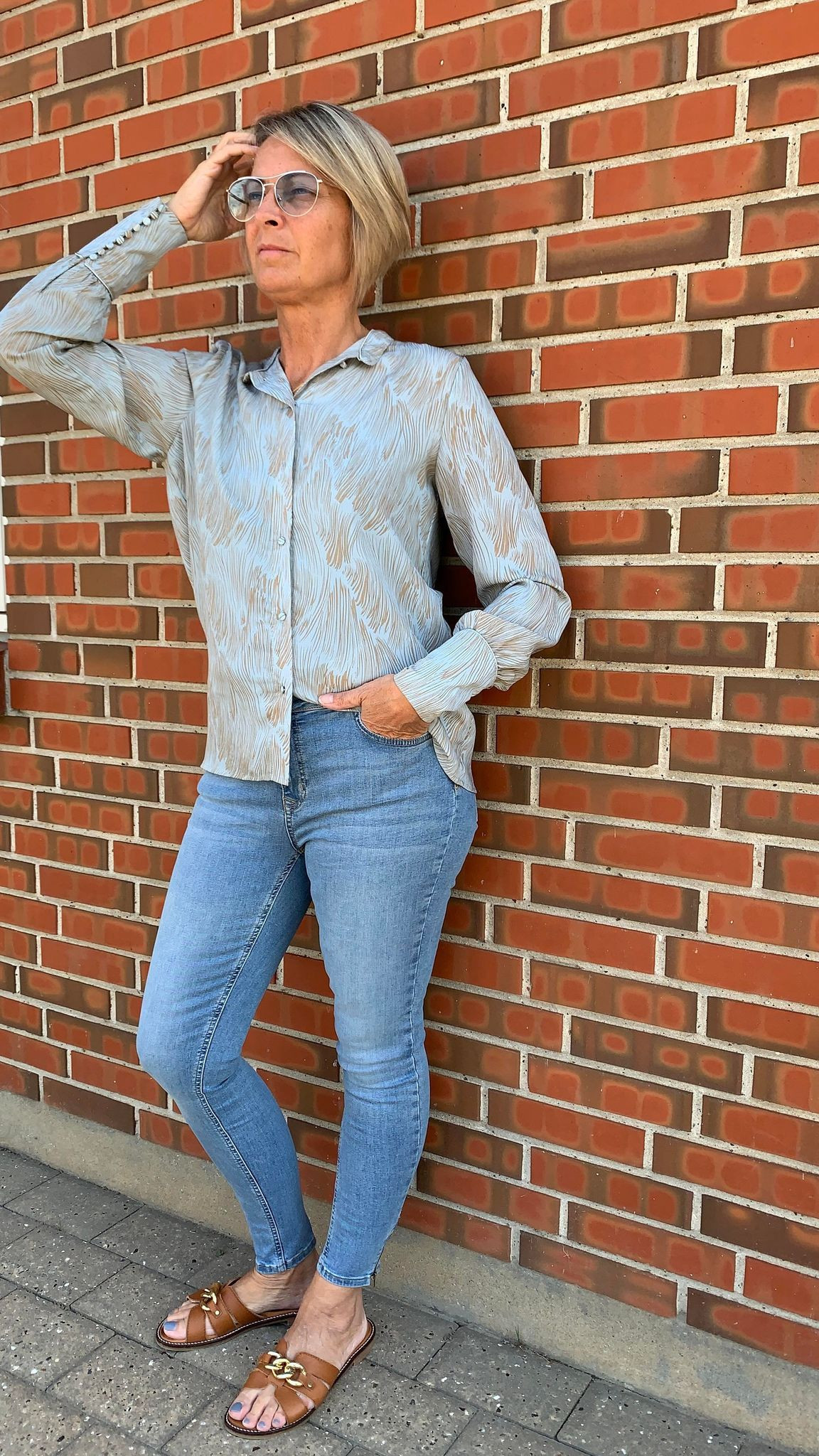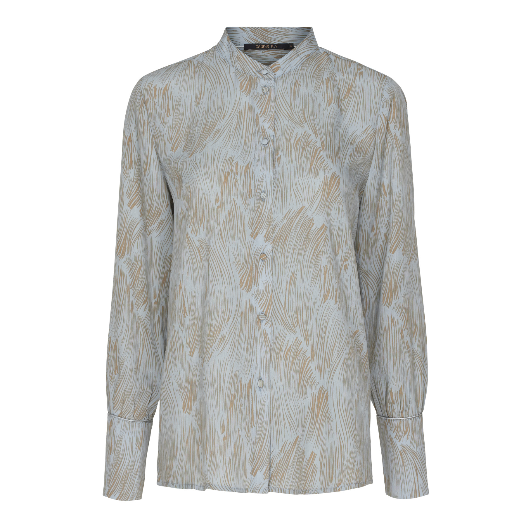 Caddis Fly lyseblå bluse med print i sandfarve. Løs model med flad krave. (Skaffevare - kan ikke returneres)