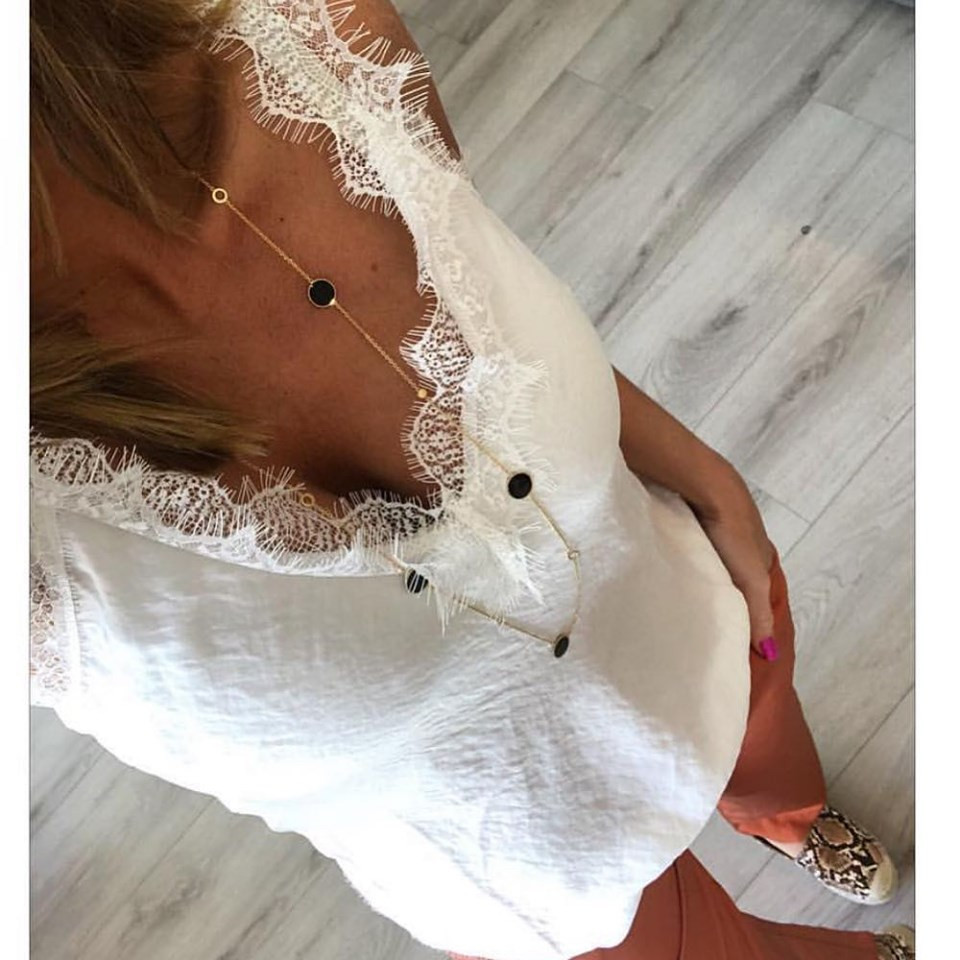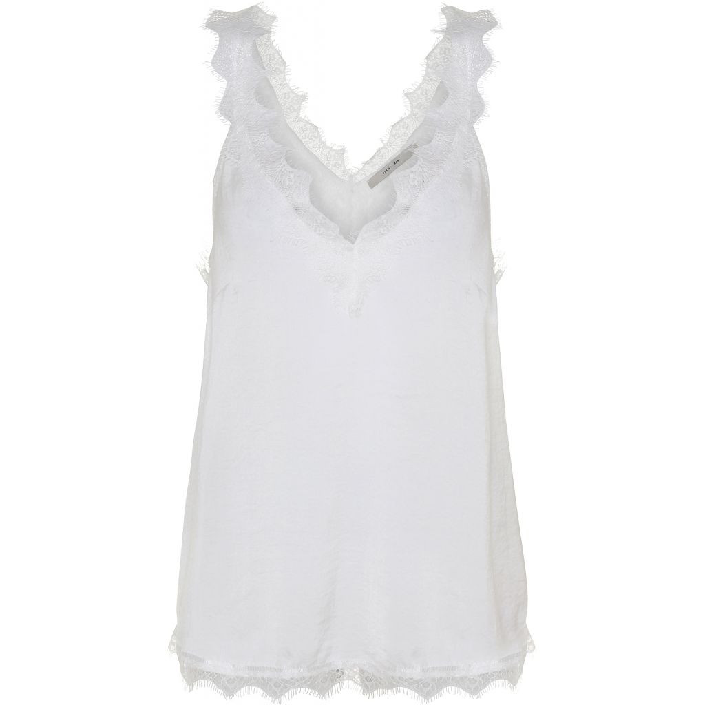 Costa Mani hvid top med blondekant. Løs model og 100% polyester. Tages ikke retur.