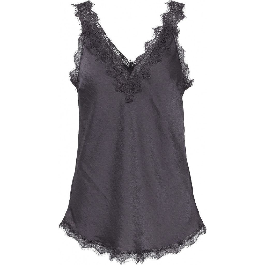 Costa Mani mørkegrå top med blondekant. Løs model og 100% polyester. Har en super pasform. Tages ikke retur.