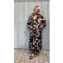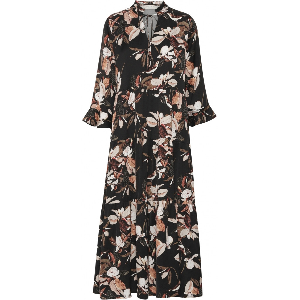 Costamani sort kjole med blade. V-hals udskæring, 3/4 lange ærmer og super fin flæse krave. Kvalitet: 55 % Viskose 45 % Rayon. (Skaffevare - kan ikke returneres)