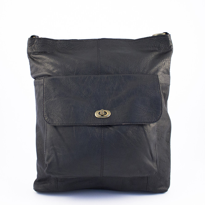 Lækker skindtaske med lomme foran. Tasken er opdelt i et stort rum med to mindre indvendige lommer og en lynlås lomme. Lukkes med lynlås. Aftagelig og justerbar crossover. Kvalitet: 100% Læder Størrelse: Stor taske H:37 x B:33 x D:5 cm