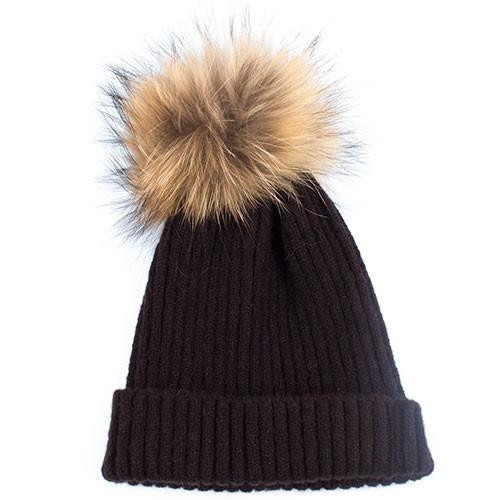 Hue i strik med pompom i pels. Kvalitet: 100% Acryl.