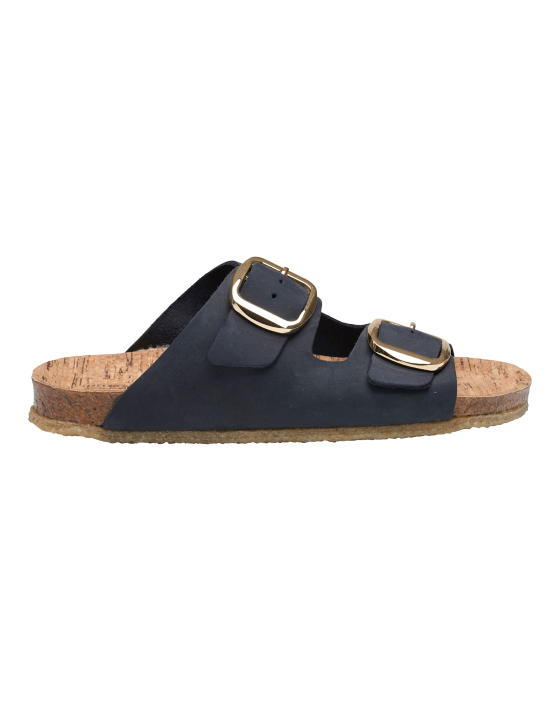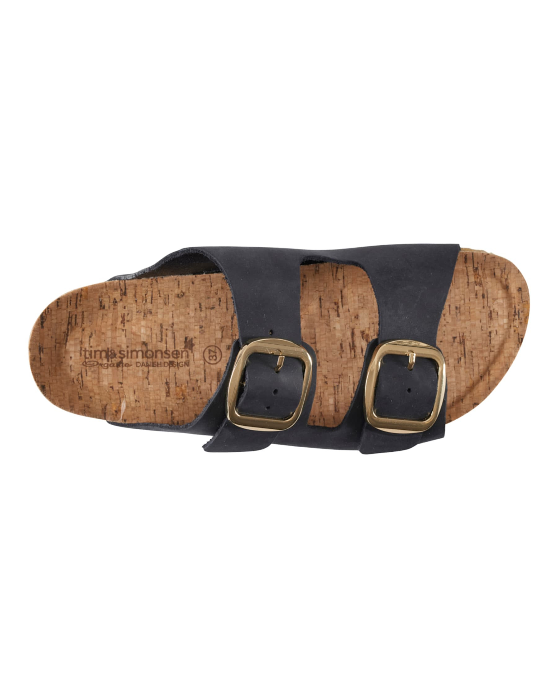Tim & Simonsen sandal i mørkeblå med guldspænde. 100% læder og med korkbund. Tages ikke retur.