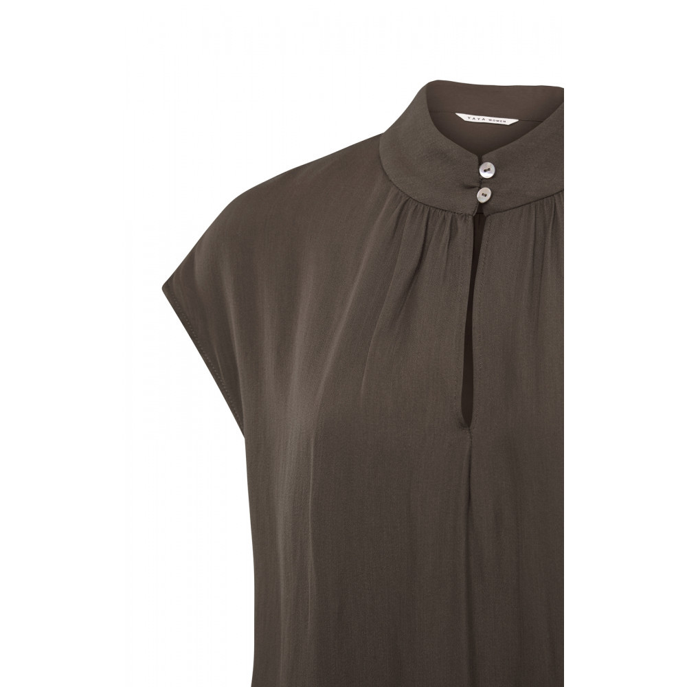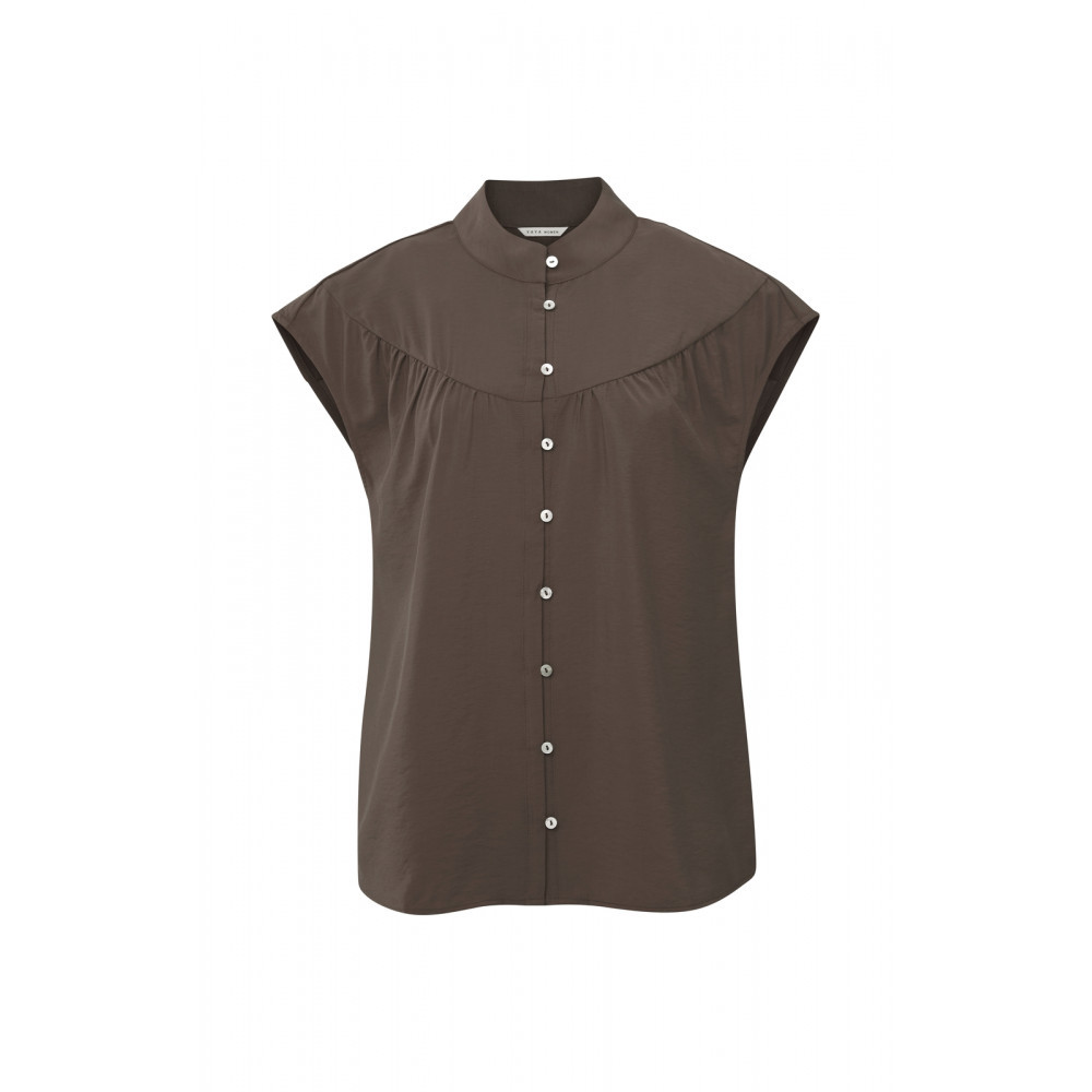 YAYA bluse i en meget smuk chokolade farve. Fine detaljer og smuk på. Brug den til bukser eller nederdel. Alm. i str. dog løs model. 85% viskose og 15% polyamid. Tages ikke retur.