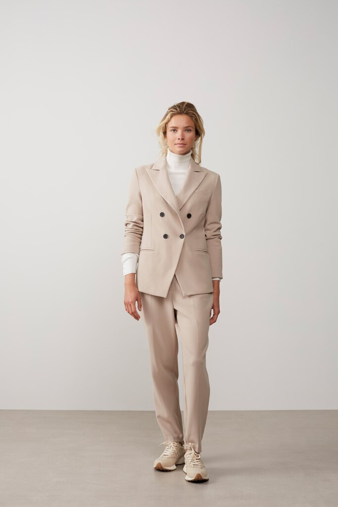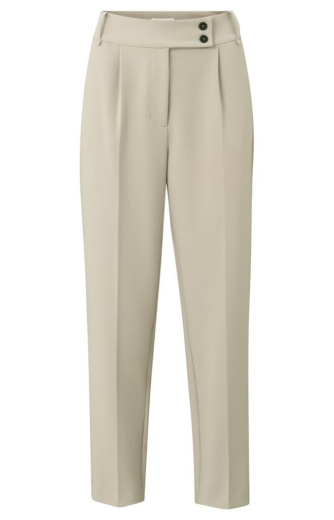 YAYA stilfulde pantaloon har en høj talje, sidelommer, knapper og en blind stolpe med lynlås. Farven er sand. Alm. i str. dog løs model. Tages ikke retur.