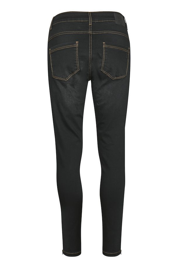 MY ESSENTIAL WARDROBE sorte jeans med høj talje. Tætsiddende med gule stikninger. Sidder perfekt og med lynlås forneden.