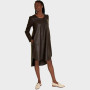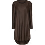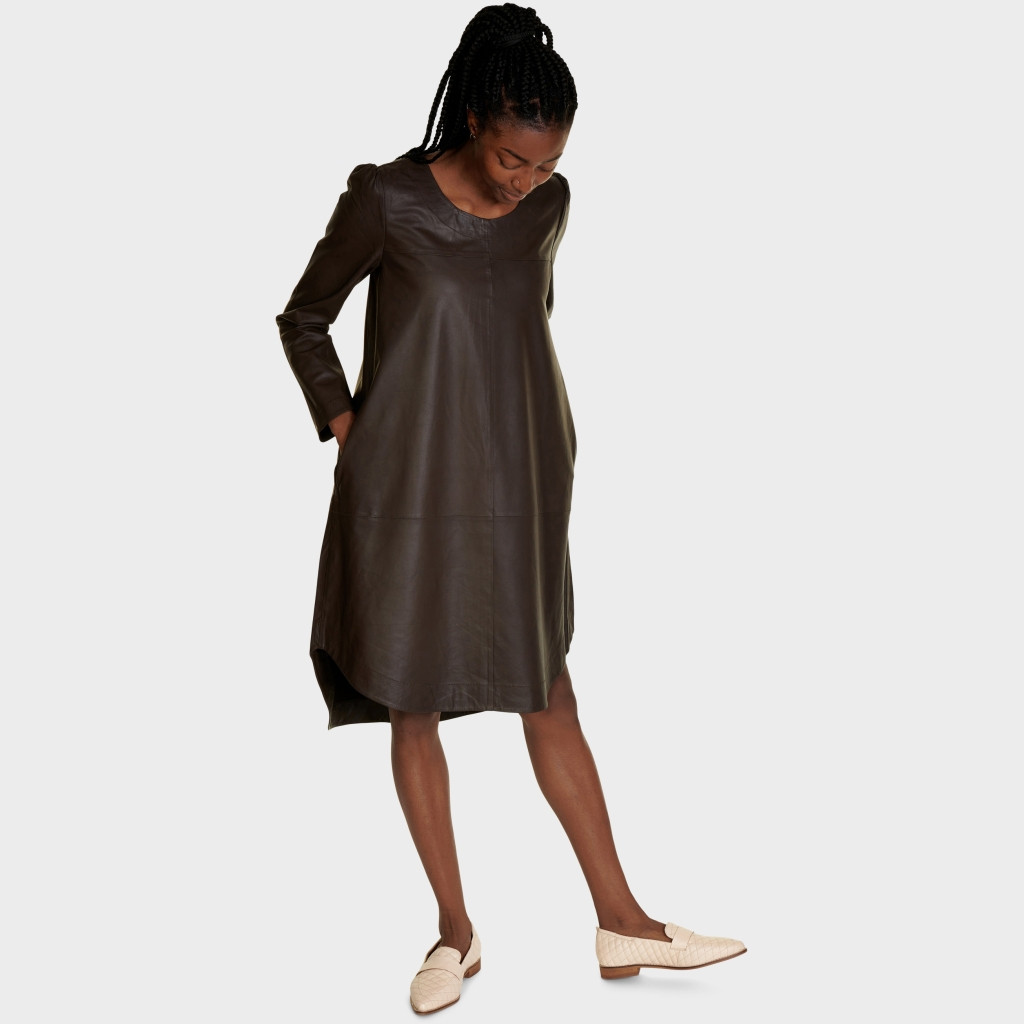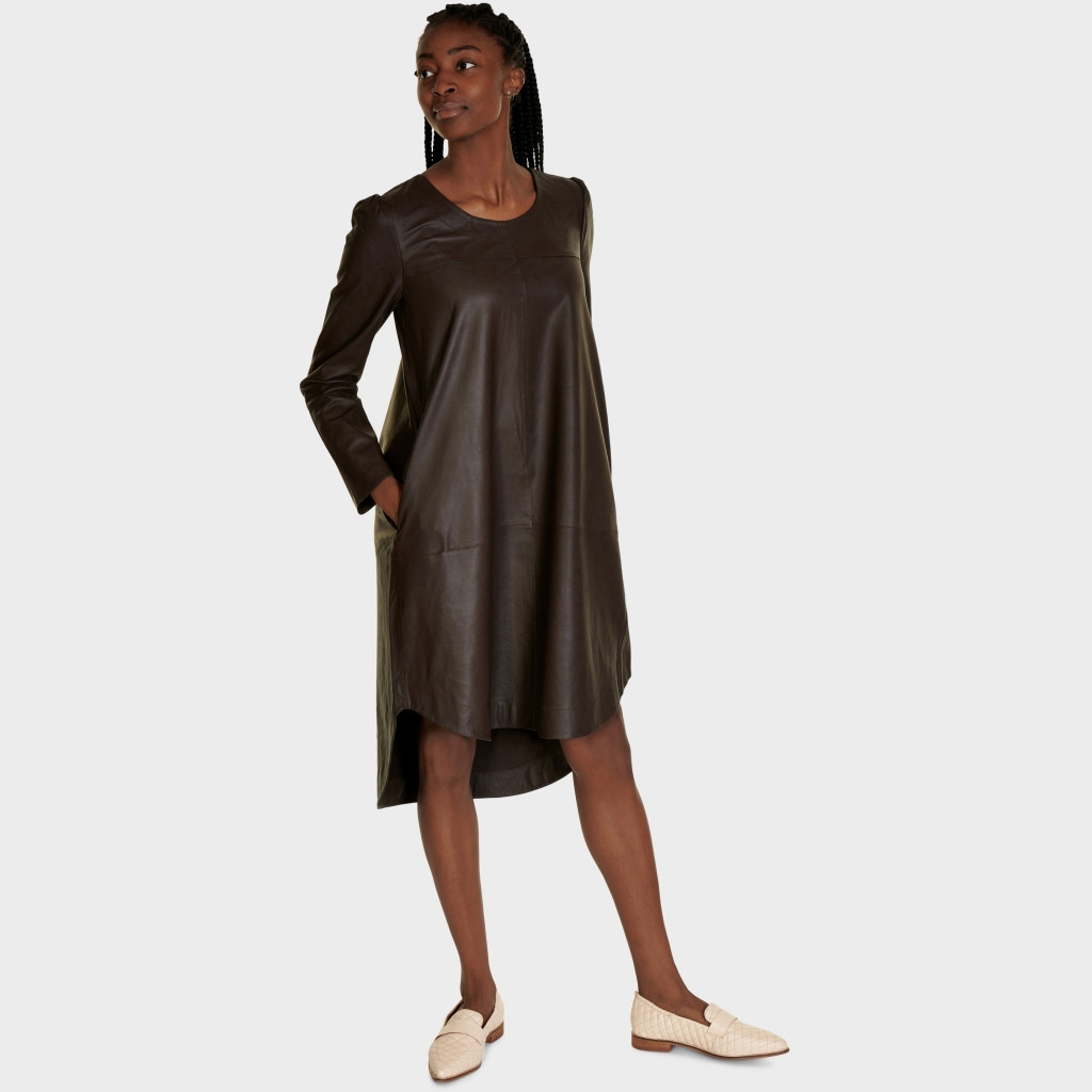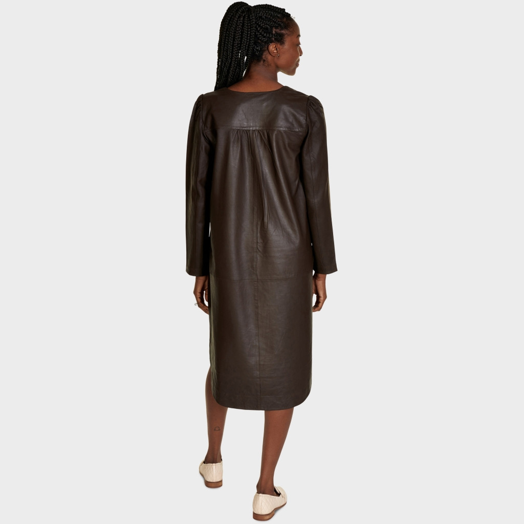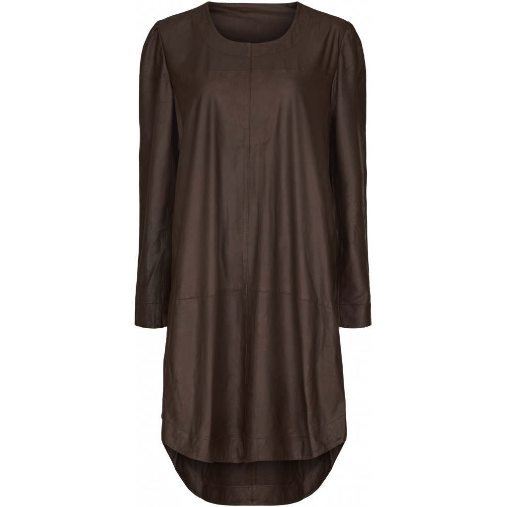 CHILI oversize kjole i blødt og behageligt læder. Har rund halsudskæring og lange ærmer. Kjolen er holdt i en simpel stil. Har dekorative syninger og rynket søm over skulderbladende. Afrundet kant forneden med slidser i siderne og med et længere bagstykke. Brystmål ca. 98 cm. (kan ikke returneres)